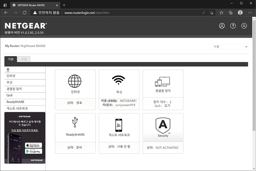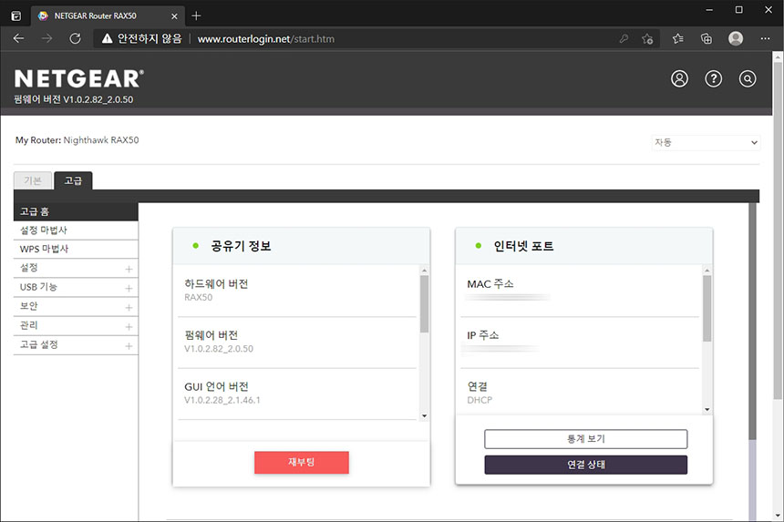 넷기어 RAX50 공유기의 관리자 페이지는 http://www.routerlogin.net 이라는 이름으로 접속할 수 있습니다. 그리고 기본 탭의 홈 메뉴를 살펴보면 현재 상태를 직관적으로 확인할 수 있습니다.