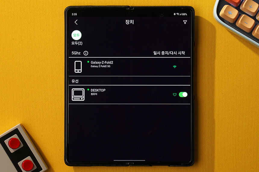 장치 관리자를 확인해 보면 현재 넷기어 RAX50 공유기에 접속해있는 장치들의 유형과 리스트를 살펴볼 수 있습니다. 특히 일시 중지/다시 시작 기능을 지원한다는 점이 편리한 부분입니다.
