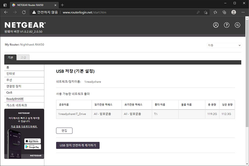 ReadySHARE에서는 넷기어 RAX50 공유기의 NAS 기능을 설정할 수 있습니다. 특히 네트워크 연결은 물론이고 HTTP와 FTP까지 지원한다는 점이 유용한 부분입니다.