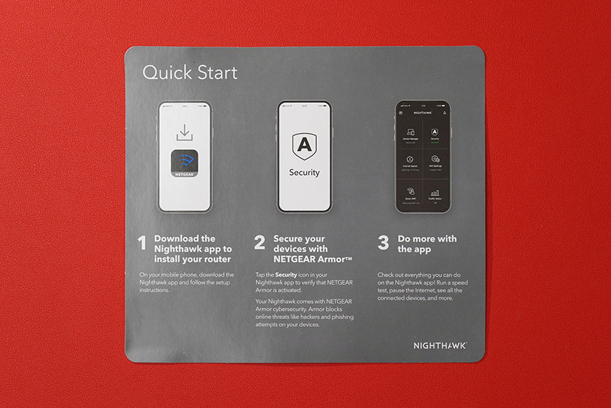 넷기어 RAX50 공유기의 구성품을 살펴보면 나이트호크 전용 앱을 이용해서 초기 설정을 진행할 수 있다는 문구 적혀 있는 빠른 시작 가이드가 한 장 제공됩니다. 참고로 정식 발매 버전은 한국어로 설명되어 있습니다.