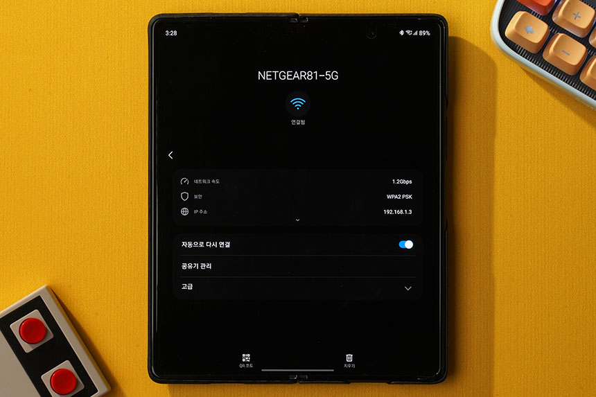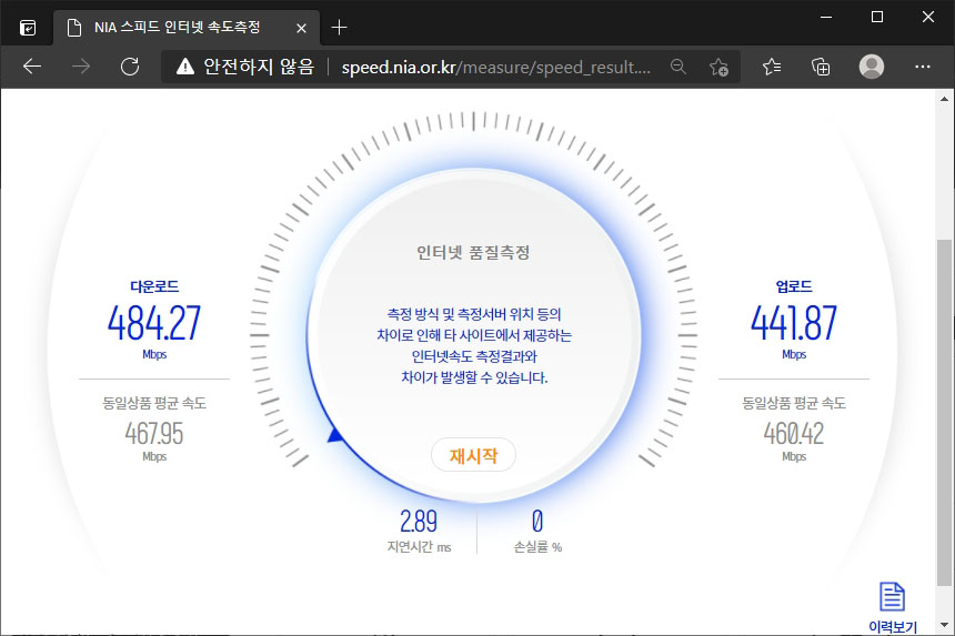 넷기어 RAX50 공유기의 무선 인터넷 속도를 확인해 보면 다운로드 속도는 445Mbps로 상당히 빠른 것을 확인할 수 있습니다. 이 정도라면 유선 연결이 필요하지는 않을 것 같습니다.