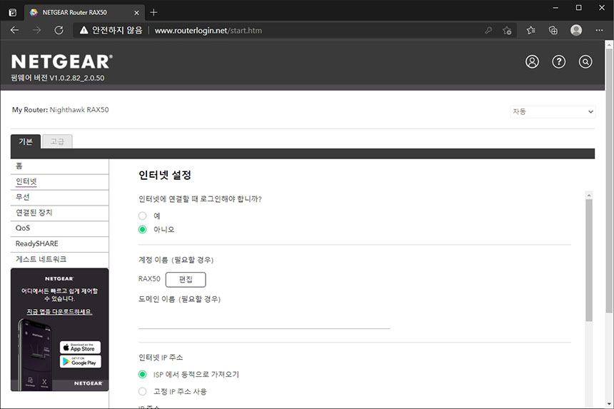 인터넷 설정에서는 연결할 때 로그인을 하거나 동적 혹은 고정 IP 관련 설정을 할 수 있습니다. 일반적인 가정에서는 설정할 필요가 없고 기업에서 넷기어 RAX50 공유기를 사용하려는 분들이 활용하면 좋을 것 같습니다.