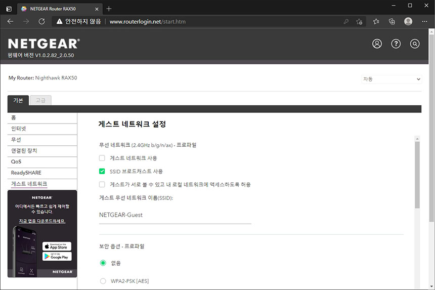 게스트 네트워크는 내부와는 분리된 별도의 손님용 네트워크를 만들어주는 기능입니다. 가정보다는 넷기어 RAX50 공유기를 회사에서 사용하려는 분들에게 적합한 기능입니다.