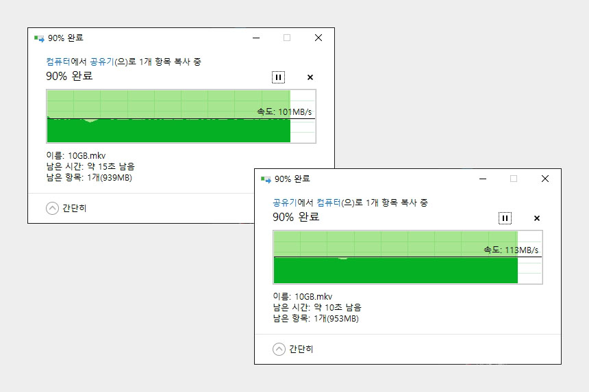 넷기어 RAX50 공유기의 USB 3.0 포트에 외장하드를 연결해서 데이터 전송 속도를 확인해 보니 읽고 쓰기가 100MB/s 이상으로 전문적인 NAS와 비교해서 차이가 없었습니다.