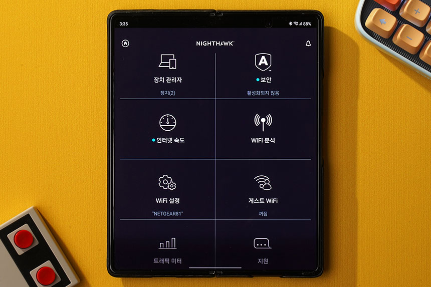 나이트호크 앱의 기본 기능을 살펴보면 장치 관리자나 보안 그리고 인터넷 속도 등 다양한 메뉴들로 구성되어 있습니다. 그래서 기본적인 작업은 관리자 페이지에 접속하지 않고도 처리할 수 있습니다.
