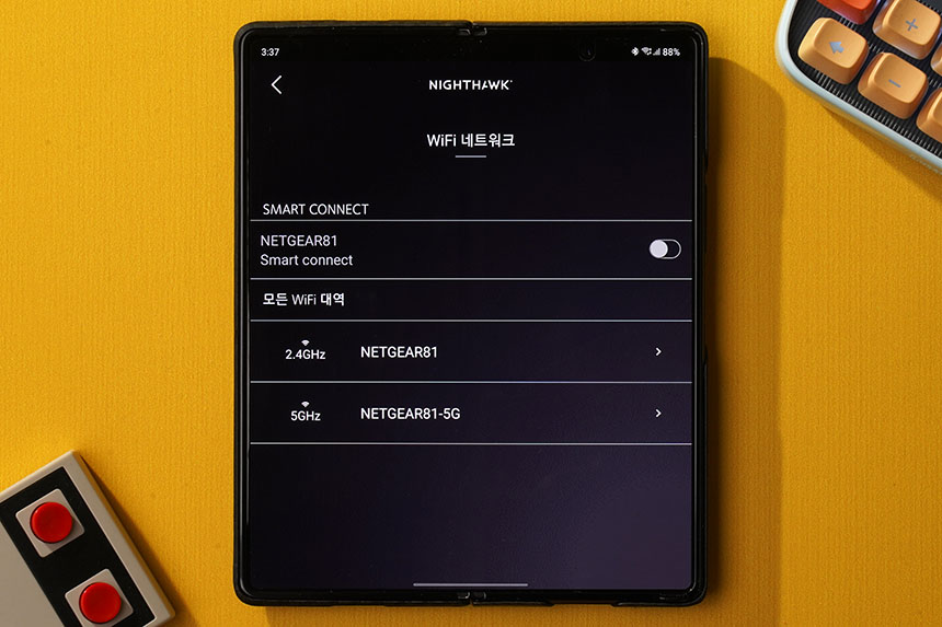 WiFi 네트워크 메뉴에서는 2.4GHz와 5GHz 대역의 이름과 암호를 변경할 수 있습니다. 그리고 스마트 커넥트 기능을 활성화하면 주파수에 상관없이 하나의 이름으로 넷기어 RAX50 공유기에 접속할 수 있습니다.