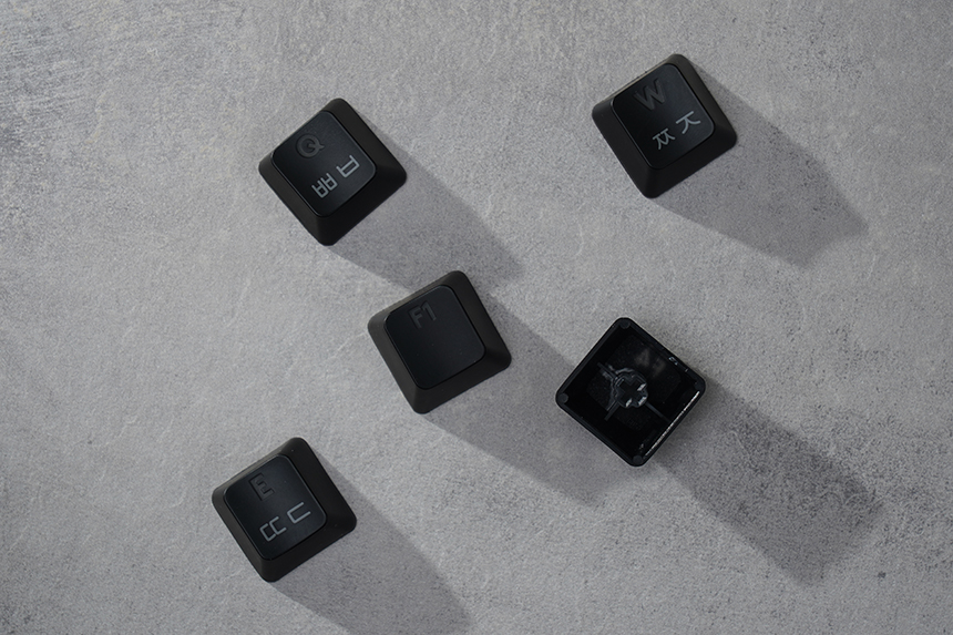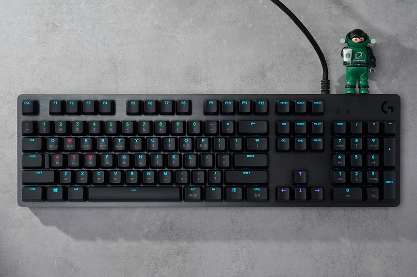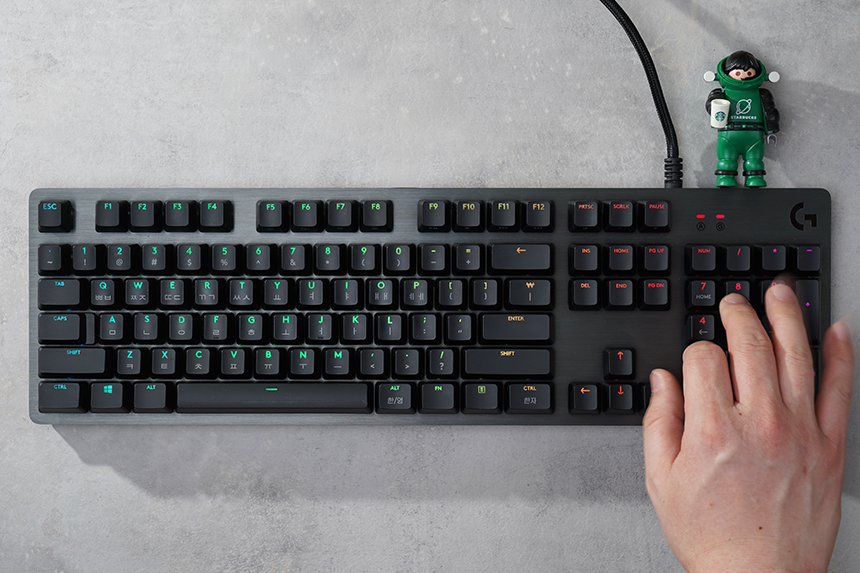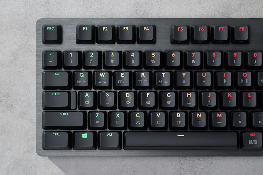 로지텍 G512 GX Red 키보드의 키캡은 정식 발매 제품이라서 당연히 한국어가 각인되어 있습니다. 그리고 코팅 처리가 되어 있어서 손가락으로 만지는 느낌이 나쁘지 않은 편이었습니다.