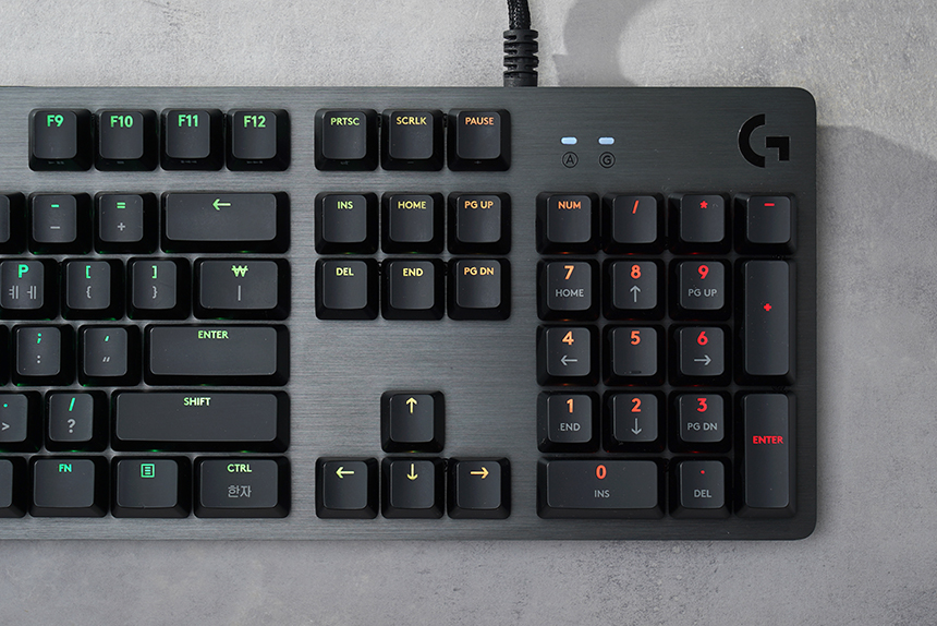 오른쪽 위를 살펴보면 로지텍의 G로고가 각인되어 있습니다. 그리고 옆쪽에는 Caps Lock과 게임 모드 여부를 확인할 수 있는 LED가 배치되어 있습니다. 참고로 게임 모드를 이용하면 윈도우 키 등을 비활성화할 수 있습니다.