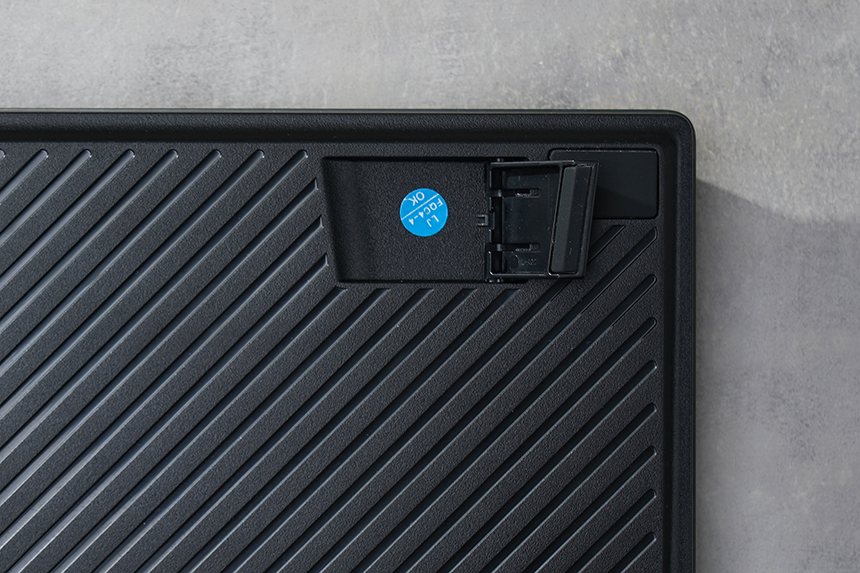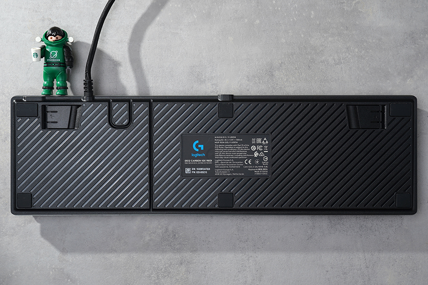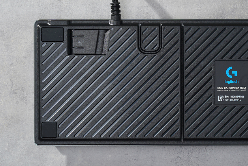 로지텍 G512 GX Red 키보드의 바닥을 살펴보면 사선으로 각인이 들어가 있다는 점이 재미있는 부분입니다. 그리고 모서리 부분에 총 6개의 고무 지지대가 배치되어 있어서 격렬한 게임을 플레이해도 책상 위에서 잘 밀리지 않습니다.