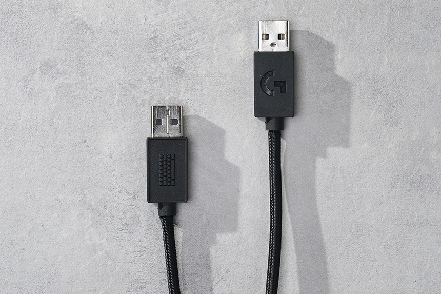 USB 패스스루 기능 때문에 USB 케이블은 총 2갈래로 제작되었습니다. 그리고 커넥터 부분에 어떤 역할을 하는지 아이콘 형태로 표시되어 있어서 컴퓨터에 연결할 때 혼란스럽지 않습니다. 그리고 키보드 케이블만 연결해도 로지텍 G512 GX Red 키보드의 동작에는 이상이 없습니다.