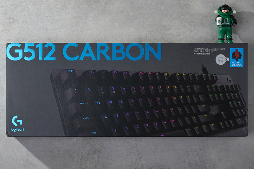 로지텍 G512 GX Red 키보드의 박스는 세련된 스타일로 제작되었습니다. 그리고 전면의 상단에는 G512 CARBON이라는 문구가 표시되어 있습니다. 참고로 스위치가 기존 Romer-G 축에서 GX 축으로 업그레이드된 제품입니다.