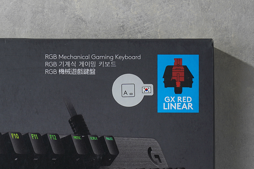 전면의 오른쪽 위에는 RGB 기계식 게이밍 키보드라는 문구와 함께 한국어가 각인되어 있다는 내용의 스티커가 부착되어 있습니다. 그리고 스위치의 종류는 GX Red 리니어와 GX Brown 택타일 그리고 GX Blue 클릭키 중에서 선택할 수 있습니다. 다양한 게이머의 취향에 대응할 수 있다는 점이 기계식 키보드의 매력적인 부분 중의 하나입니다.