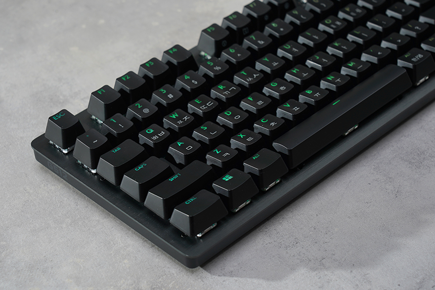 시프트 키나 스페이스바에는 체리식 스테빌라이저가 적용되었습니다. 그래서 길이가 긴 키캡의 테두리 부분을 눌러도 안정적으로 입력이 되도록 설계되었습니다. 소리도 크게 거슬리지 않았습니다.
