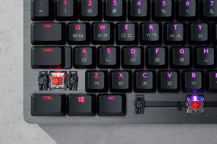 로지텍 G512 GX Red 키보드의 키캡은 정식 발매 제품이라서 당연히 한국어가 각인되어 있습니다. 그리고 코팅 처리가 되어 있어서 손가락으로 만지는 느낌이 나쁘지 않은 편이었습니다.