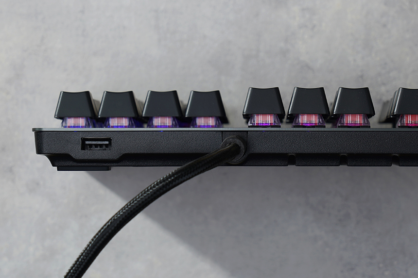 로지텍 G512 GX Red 키보드의 특징을 살펴보면 일종의 연장선이라고 할 수 있는 USB 패스스루 포트를 탑재하고 있습니다. 그래서 책상 위를 조금 더 깔끔하게 정리할 수 있습니다. 그리고 바디는 내구성이 우수한 항공기용 등급의 5052 알루미늄 마그네슘 합금으로 제작되었습니다.