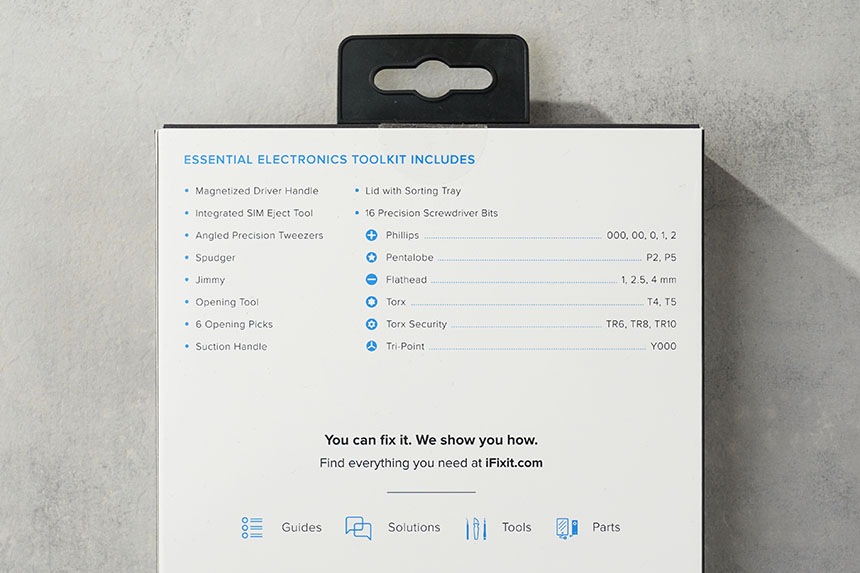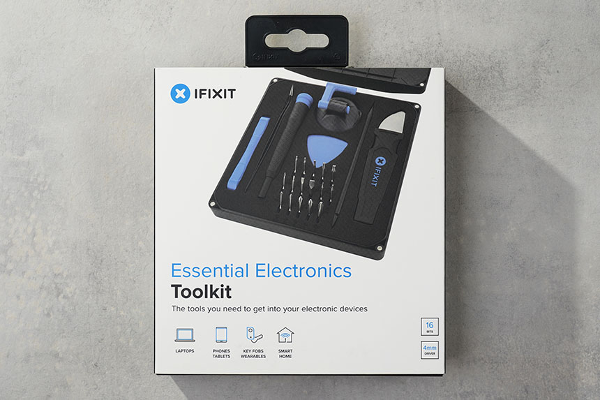 iFixit 기본 드라이버 수리 툴 키트의 박스는 깔끔한 형태로 제작되었습니다. 그리고 아래쪽에는 노트북과 스마트폰 그리고 태블릿과 스마트 홈 기기들을 고치는 용도로 사용하라는 문구가 표시되어 있습니다.