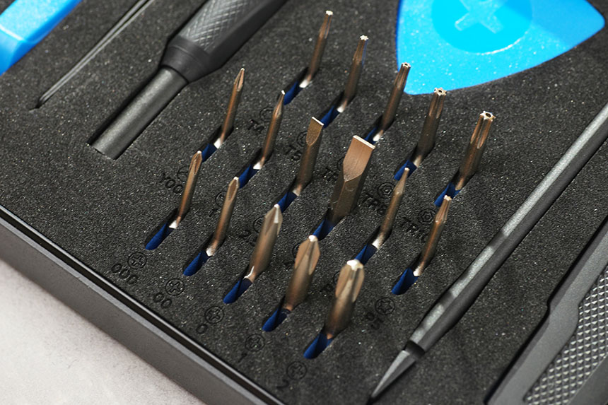 그리고 보통 이러한 형태의 제품들은 스펀지에 손가락을 넣을 수 있는 구멍을 만들어 놓는 경우가 많은데요. iFixit 기본 드라이버 수리 툴 키트의 경우에는 아래쪽을 눌러서 꺼낼 수 있도록 제작되었습니다.