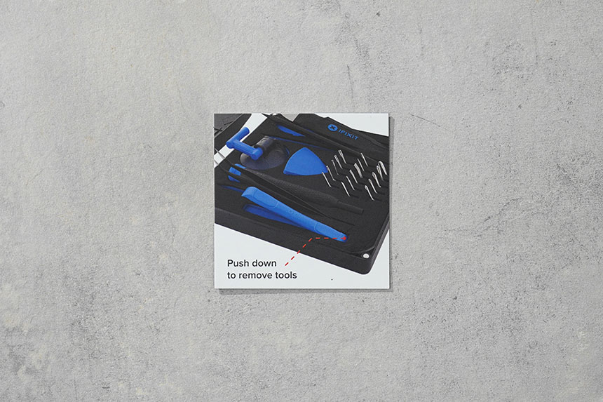 그리고 각종 공구는 아래쪽을 눌러서 꺼내라는 문구가 인쇄된 가이드가 한 장 포함되어 있습니다. 잠시 후에 살펴보도록 하겠습니다. 전체적인 만듦새와 구성은 깔끔한 편이라고 생각되었습니다.