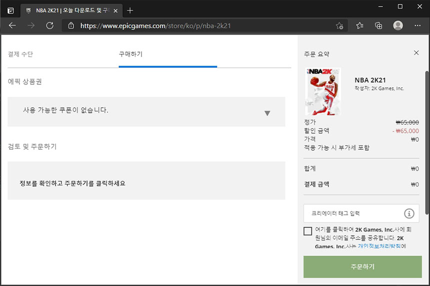 다음 단계에서 구매하기를 선택하면 NBA 2K21를 라이브러리에 추가할 수 있습니다. 그리고 이메일 주소 공유를 체크하면 나중에 게임 제조사에서 메일이 올지 모릅니다.