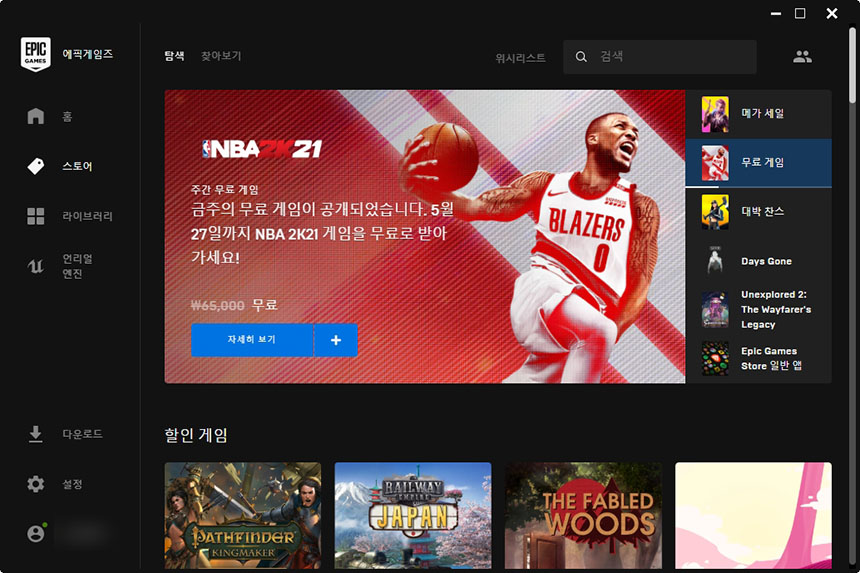 NBA 2K21를 다운로드 받기 위해서는 우선 에픽게임즈 런처를 실행시켜야 합니다. 그럼 스토어에 메가 세일과 함께 무료게임 내용이 표시되어 있습니다. 참고로 메가 세일에는 사이버펑크 2077와 레드 데드 리뎀션2와 같은 게임들이 포함되어 있습니다. 11,000원 상품과 결합하면 제법 할인율이 높은 편입니다.