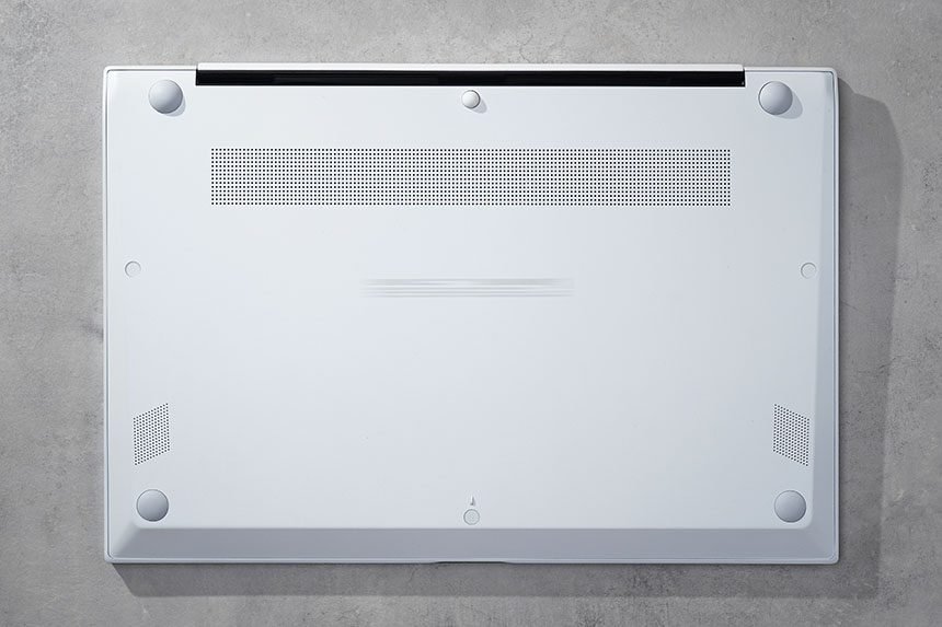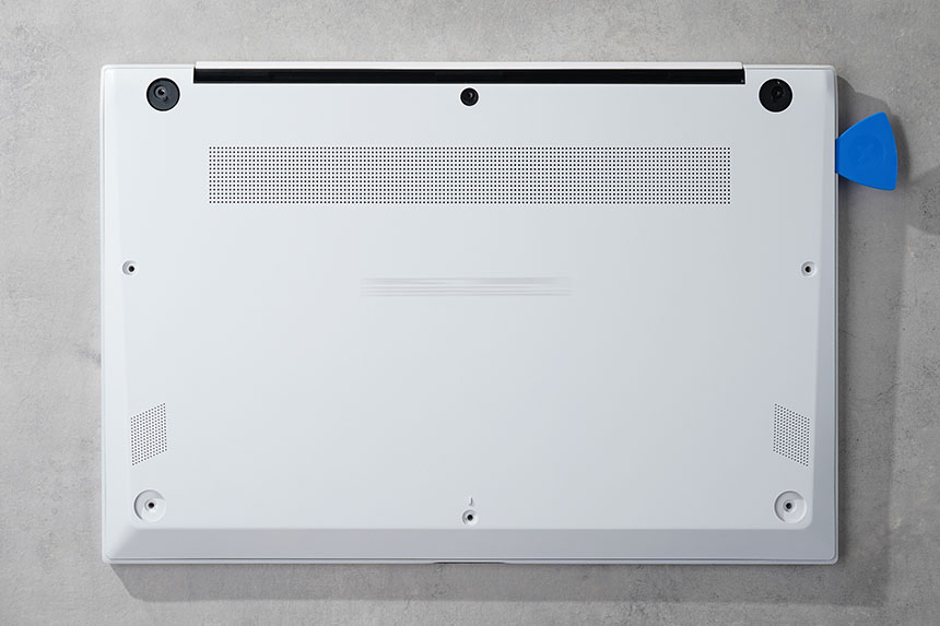 자 이제 LG 그램 16을 분해하면서 가장 어려운 단계에 도달했습니다. 바로 하판을 분리하는 작업인데요. 카드와 같이 상처가 나지 않는 공구를 이용해서 위쪽부터 걸쇠를 분리해야 합니다. 이때 너무 강한 힘으로 작업하면 걸쇠가 파손될 수 있으니 주의하시길 바랍니다.