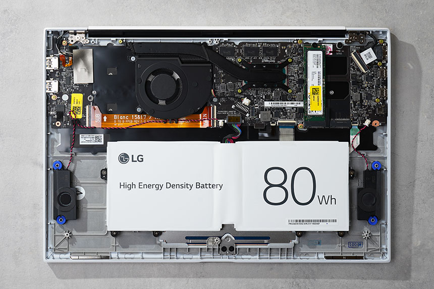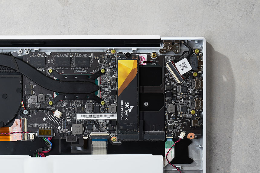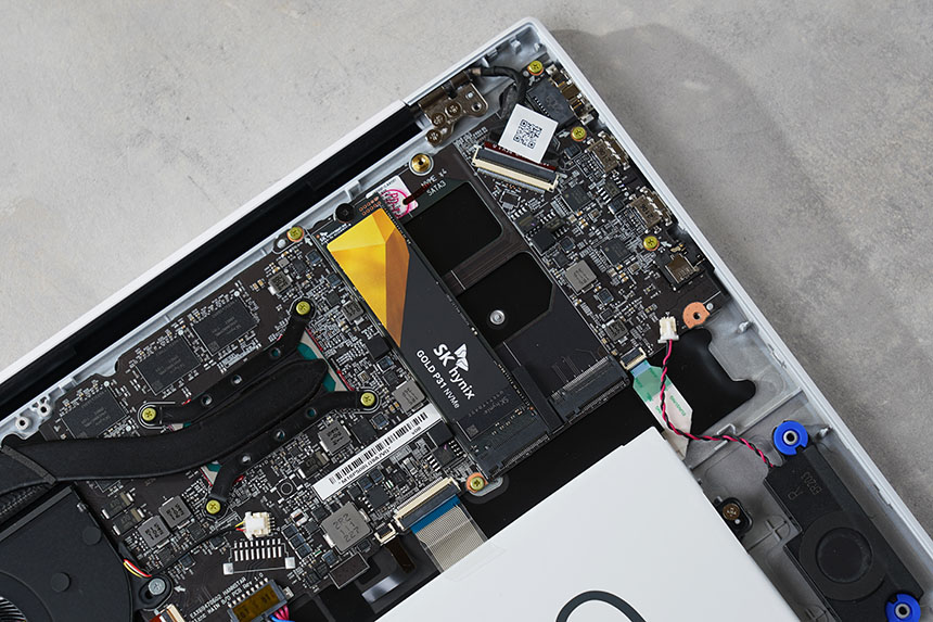 하판을 분리하면 LG 그램 16의 부품들을 확인할 수 있습니다. 우선 M.2 슬롯은 2개가 준비되어 있고 2021년 버전은 메모리가 LPDDR4x로 변경되어서 구매 후에 따로 추가할 수는 없습니다.