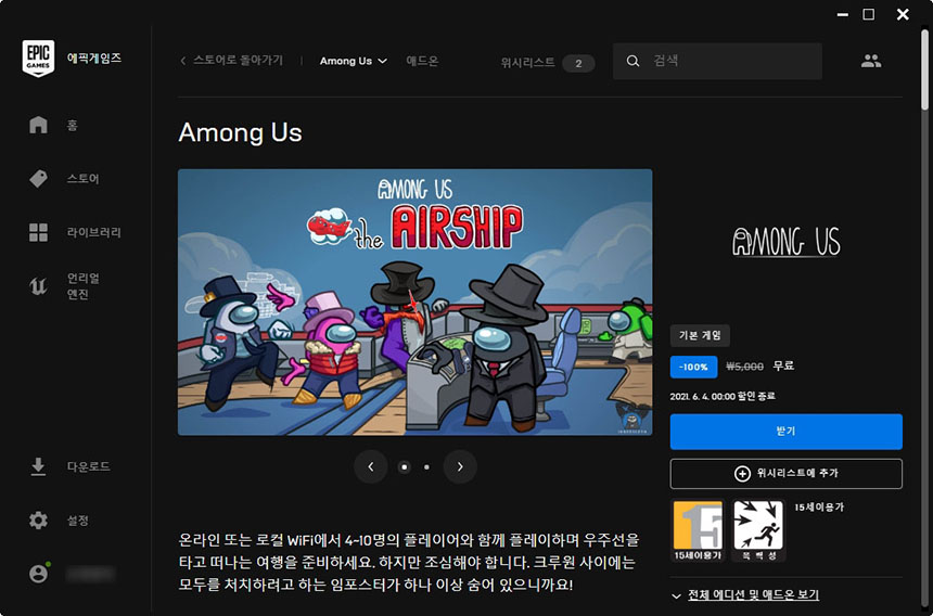 런처의 중간에 배치된 무료 게임의 어몽어스를 선택하면 받기라는 메시지가 활성화되어 있는 것을 확인할 수 있습니다. 참고로 원래 판매 가격은 5,000원으로 상당히 저렴한 편입니다.