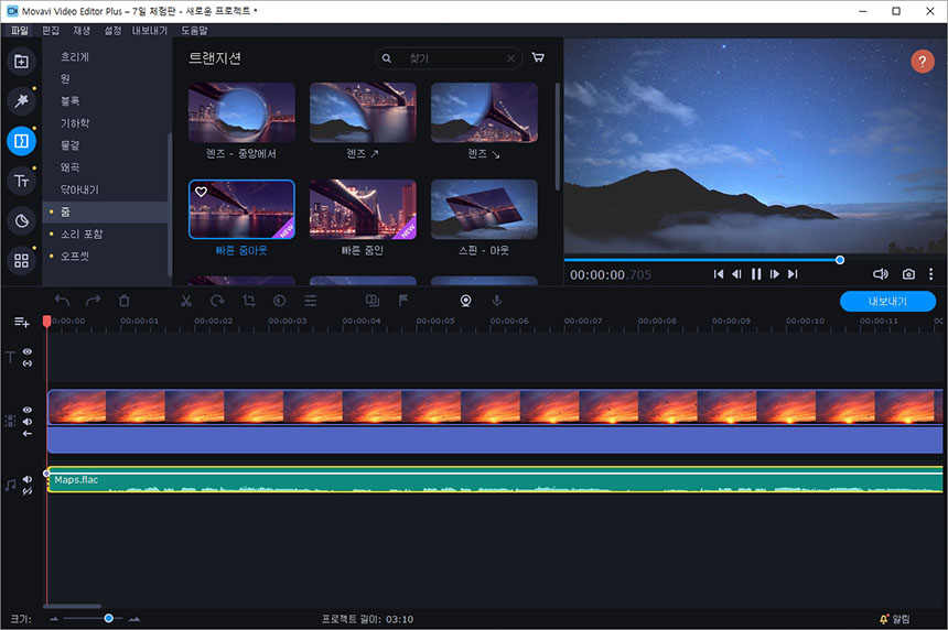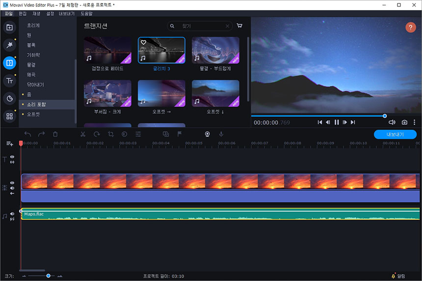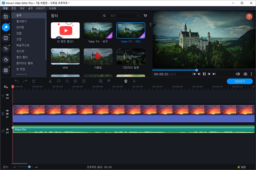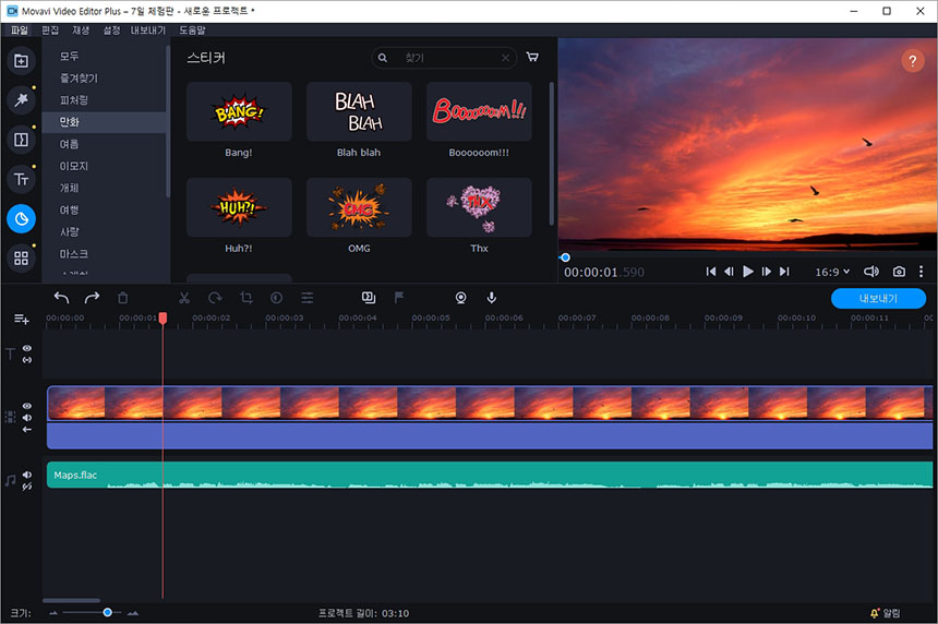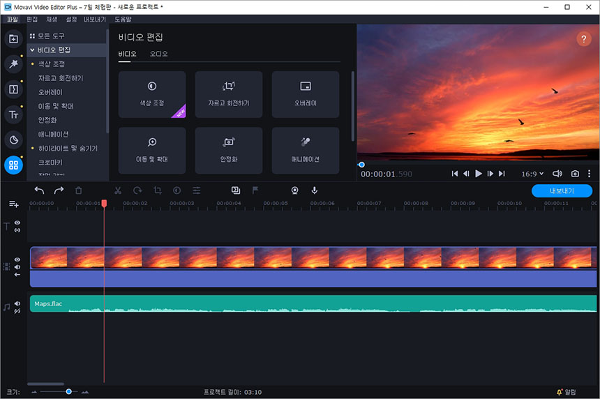 모바비 비디오 에디터 플러스 2021의 특징을 살펴보면 일반적인 동영상 편집 프로그램과 동일하게 타임라인 기반으로 비디오 클립과 이미지 그리고 오디오를 편집할 수 있습니다. 그리고 다양한 트랜지션과 필터 그리고 애니메이션과 크로마키 등의 기능을 지원합니다.