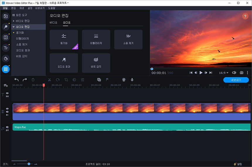 오디오 편집에서는 별도로 촬영한 비디오 클립과 오디오를 자동으로 동기화할 수 있는 기능이 지원됩니다. 소리를 신경 써서 녹화해야 하는 동영상을 만들 때 유용한 기능입니다. 그리고 이퀄라이저나 소음 제거 그리고 오디오 효과들이 준비되어 있으니 동영상의 분위기에 따라서 활용해주는 것이 좋을 것 같습니다.