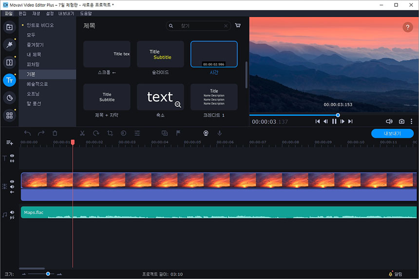 제목 메뉴에서는 인트로 비디오를 만들어 줄 수 있는 기능이 포함되어 있습니다. 다양한 종류의 프리셋들이 준비되어 있으니 적절하게 활용해서 자신만의 개성이 넘치는 인트로 영상을 만들어 보시길 바랍니다. 초보자들도 클릭 몇 번으로 간단하게 구성이나 텍스트 등을 변경할 수 있습니다.