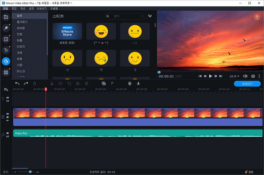 스티커 기능을 이용하면 이모지나 다양한 개체들을 동영상의 중간중간에 삽입할 수 있습니다. 동영상을 조금 더 풍성하고 재미있게 만들어주는 요소들이라고 할 수 있습니다.