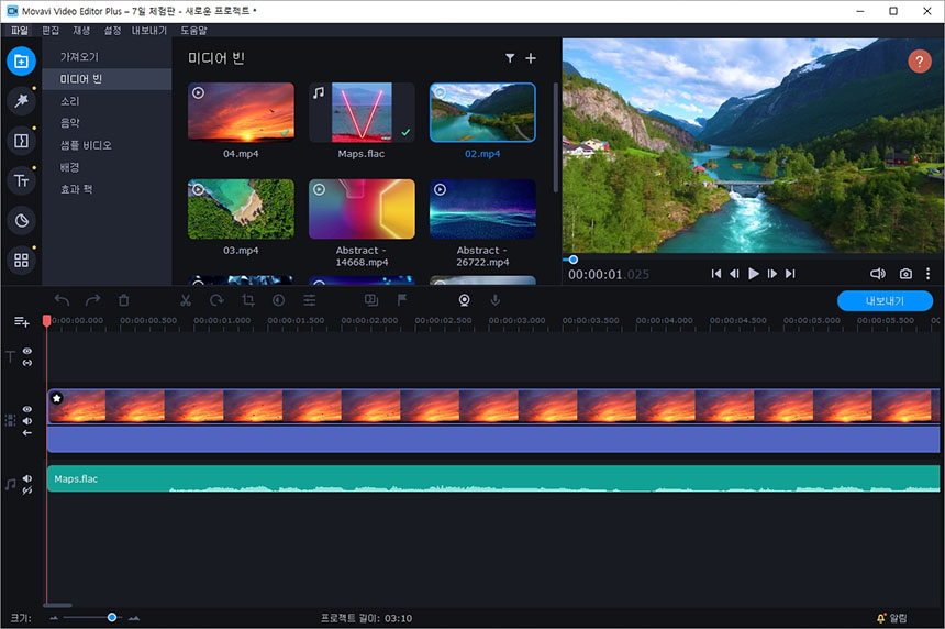 음악과 샘플 비디오에서는 편리하게 영상을 제작하기 위한 소스들이 준비되어 있습니다. 동영상의 분위기에 따라서 활용해주는 것이 좋을 것 같습니다. 그리고 유튜브 오디오 보관함이나 픽사베이 등을 이용하면 무료로 다양한 음성과 영상 소스를 다운로드 받아서 자신의 동영상을 더욱 완성도 있게 만들어줄 수 있습니다.