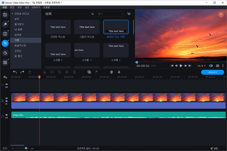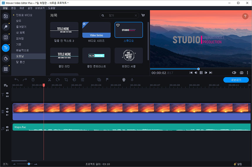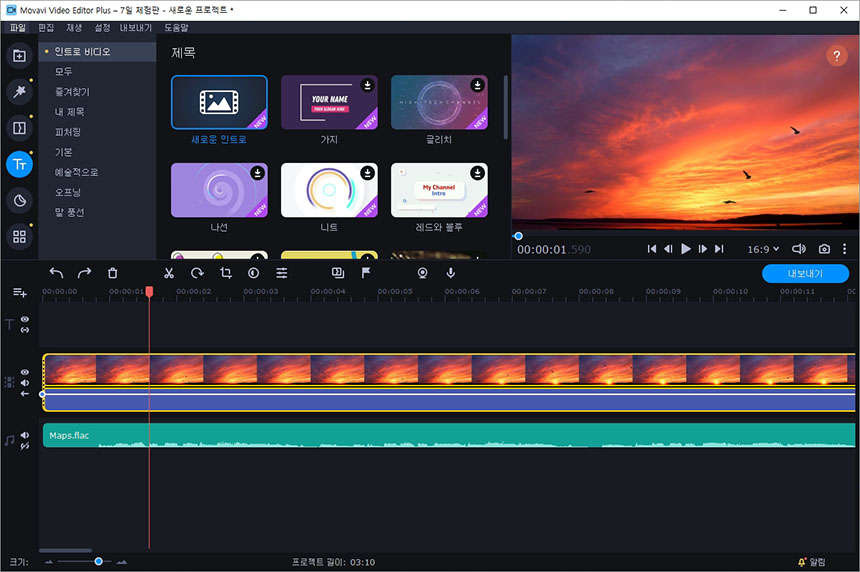 제목 메뉴에서는 인트로 비디오를 만들어 줄 수 있는 기능이 포함되어 있습니다. 다양한 종류의 프리셋들이 준비되어 있으니 적절하게 활용해서 자신만의 개성이 넘치는 인트로 영상을 만들어 보시길 바랍니다. 초보자들도 클릭 몇 번으로 간단하게 구성이나 텍스트 등을 변경할 수 있습니다.