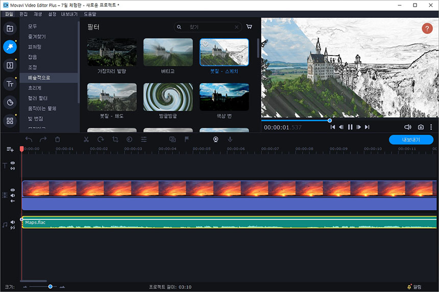 제가 추천하는 필터는 예술적으로의 붓질 – 스케치와 컬러 필터의 다양한 프리셋 들입니다. 적절하게 풍경에 적용하면 동영상의 톤을 조금 더 느낌 있게 변경해 줄 수 있습니다.