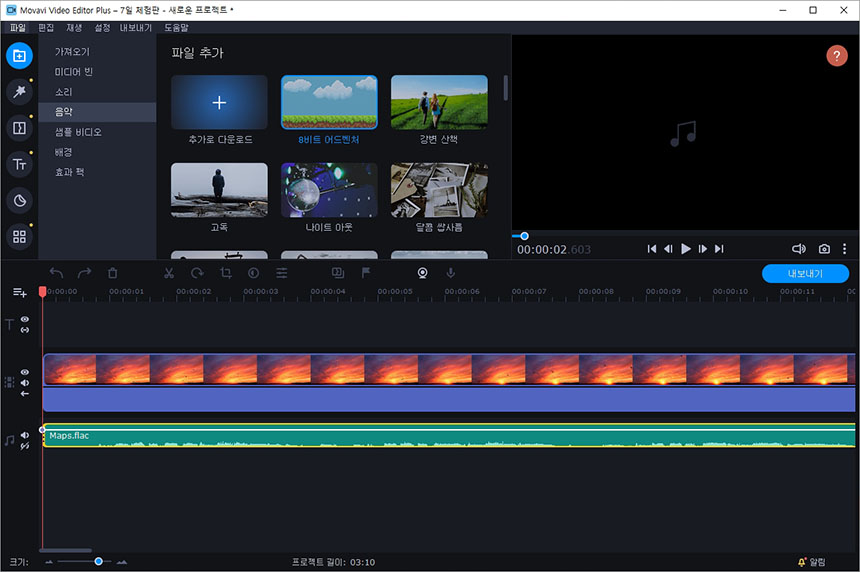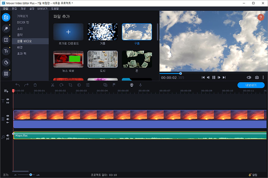 음악과 샘플 비디오에서는 편리하게 영상을 제작하기 위한 소스들이 준비되어 있습니다. 동영상의 분위기에 따라서 활용해주는 것이 좋을 것 같습니다. 그리고 유튜브 오디오 보관함이나 픽사베이 등을 이용하면 무료로 다양한 음성과 영상 소스를 다운로드 받아서 자신의 동영상을 더욱 완성도 있게 만들어줄 수 있습니다.