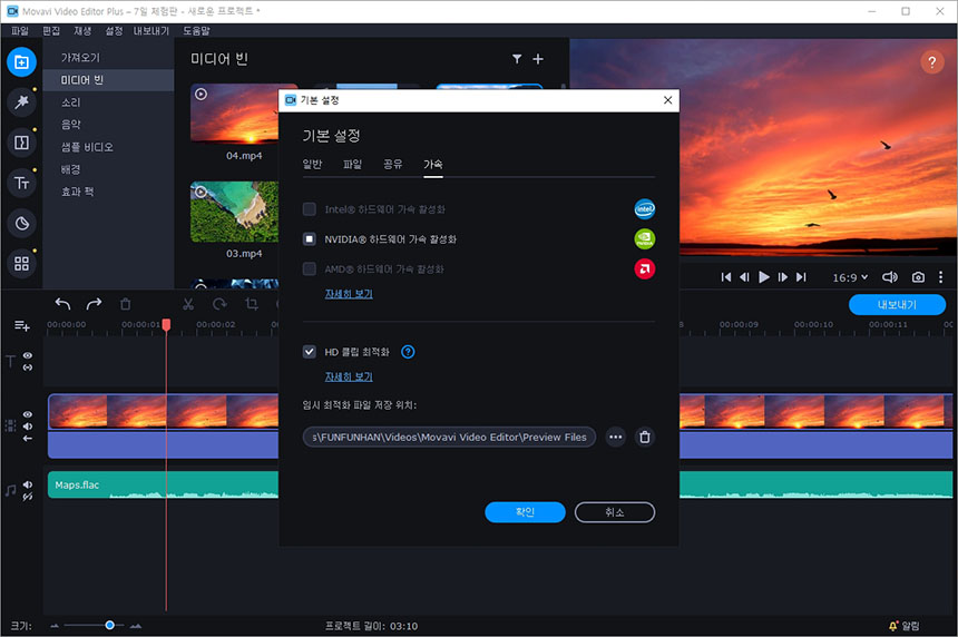 그리고 인텔이나 엔비디아 그리고 AMD 그래픽카드를 탑재한 제품들을 위해서 하드웨어 가속 기능도 내장하고 있습니다. 그리고 조금 더 빠르게 비디오 프로세싱을 할 수 있습니다.