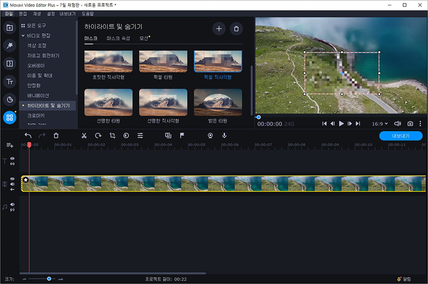 하이라이트 및 숨기기에서는 동영상의 특정 부분에 모자이크를 설정할 수 있습니다. 그리고 전문적인 동영상 편집 프로그램처럼 모션 트래킹 기능이 탑재되어 있다는 점이 인상적인 부분이었습니다.
