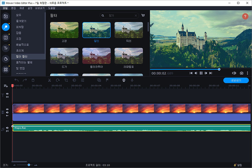 오디오 편집에서는 별도로 촬영한 비디오 클립과 오디오를 자동으로 동기화할 수 있는 기능이 지원됩니다. 소리를 신경 써서 녹화해야 하는 동영상을 만들 때 유용한 기능입니다. 그리고 이퀄라이저나 소음 제거 그리고 오디오 효과들이 준비되어 있으니 동영상의 분위기에 따라서 활용해주는 것이 좋을 것 같습니다.
