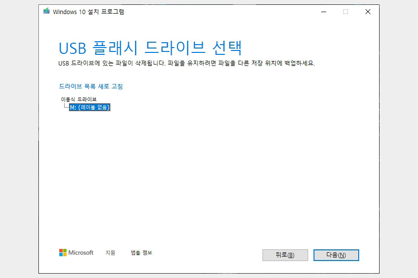 8GB 이상의 USB 드라이브를 컴퓨터에 연결하면 이동식 드라이브에 자동으로 리스트가 표시됩니다. 만약 여러 개가 장착되어 있으면 신중하게 선택하는 것이 좋을 것 같습니다. 잘 못 선택하면 포맷이 될 수 있습니다.