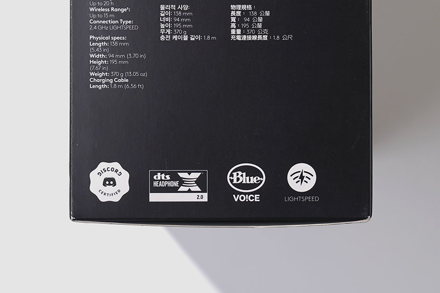옆면의 아래쪽을 살펴보면 최근에 가장 많이 사용되고 있는 음성 채팅용 인스턴트 메신저 디스코드(Discord)의 인증을 받은 제품이라는 문구가 표시되어 있습니다. 그 외에도 로지텍 G PRO X 무선 헤드셋에 탑재된 각종 기술의 로고가 인쇄되어 있습니다.