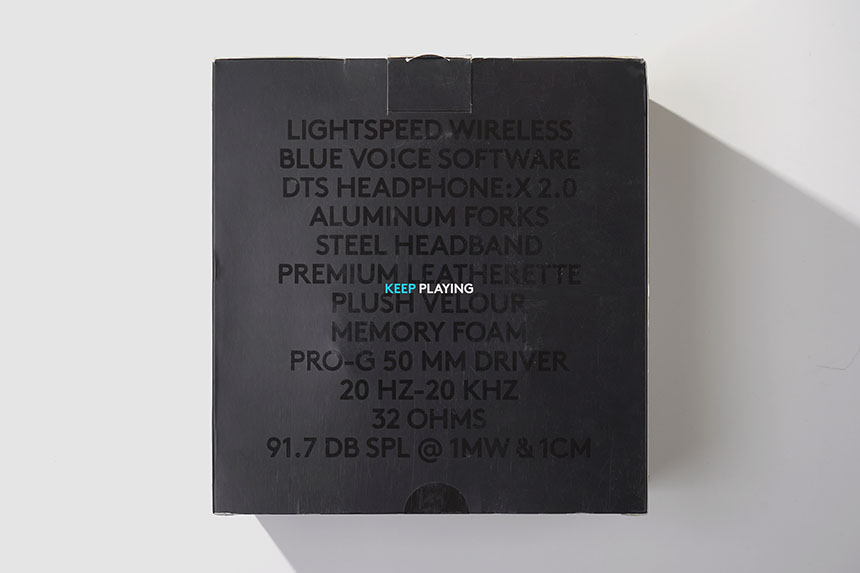 박스의 뒷면을 살펴보면 로지텍 G PRO X 무선 헤드셋의 특징들이 인쇄되어 있습니다. 블루 보이스(BLUE VO!CE) 최첨단 마이크와 DTS 헤드폰:X 2.0 7.1채널 서라운드 사운드 기능을 지원한다는 특징이 있습니다.