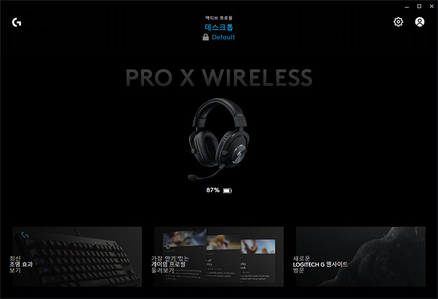 로지텍 지 허브 소프트웨어를 설치하면 로지텍 G PRO X 무선 헤드셋이 자동으로 검색되고 현재 배터리 상태를 확인할 수 있습니다. 특히 다른 로지텍 게이밍 기어도 하나의 프로그램으로 관리할 수 있다는 점이 편리한 부분입니다.