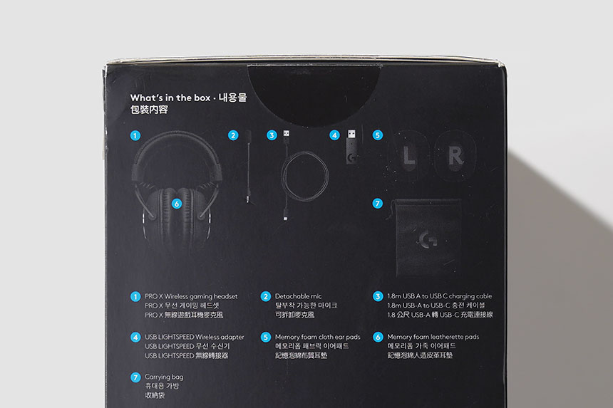 박스의 옆면에는 로지텍 G PRO X 무선 헤드셋의 구성품이 설명되어 있습니다. 일상적으로 사용하기에 부족하지 않은 구성이라고 판단되었고 특히 휴대용 가방까지 별도로 제공된다는 점이 인상적이었습니다.