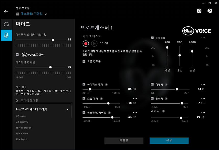 마이크에서는 블루 보이스 기능을 활성화할 수 있습니다. 각종 필터나 소음 제거 기능을 세부적으로 변경할 수 있고 테스트할 수 있는 기능도 제공하기 때문에 자신이 원하는 사운드를 찾을 수 있습니다.