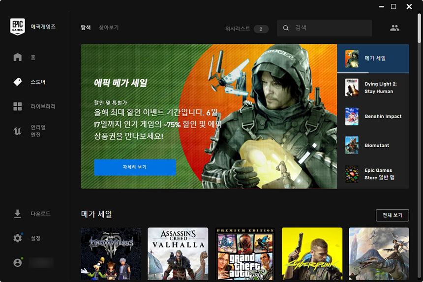 우선 에픽게임즈 런처를 실행시키면 우선 에픽 메가 세일이 진행되고 있는 것을 확인할 수 있습니다. 특히 6월 18일까지 제공되는 11,000원 상품권과 결합해서 사용하는 상당히 저렴하게 게임을 구매할 수 있습니다.