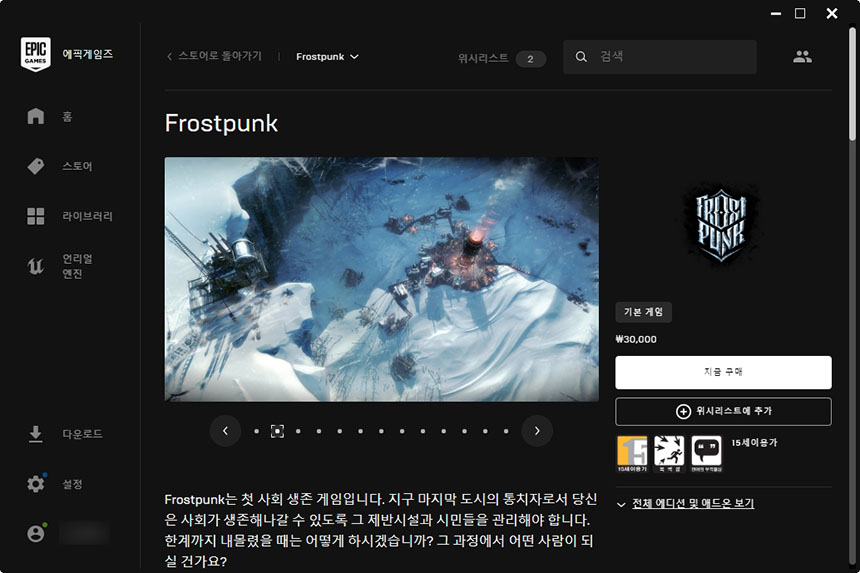 아래쪽에 배치된 무료 게임을 확인해보면 프로스트 펑크가 6월 11일까지 무료로 제공됩니다. 그리고 평소에 판매되는 가격은 30,000원으로 크게 부담이 되는 가격은 아닙니다.