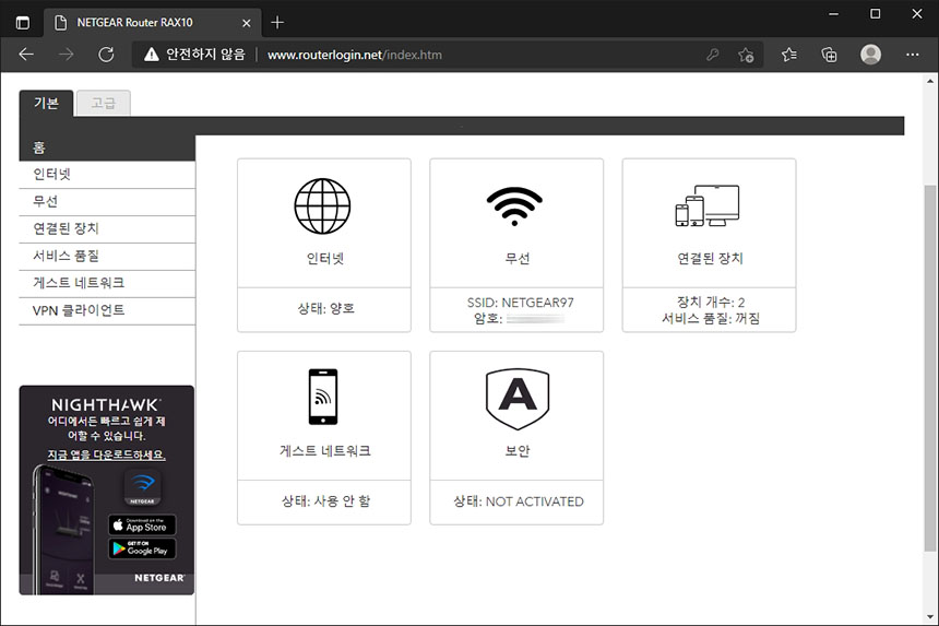 넷기어 RAX10 공유기의 관리자 페이지는 www.routerlogin.net이라는 주소로 접속할 수 있습니다. 우선 기본 탭의 홈 화면에서는 현재 상태를 한 눈에 확인할 수 있도록 구성되어 있습니다.