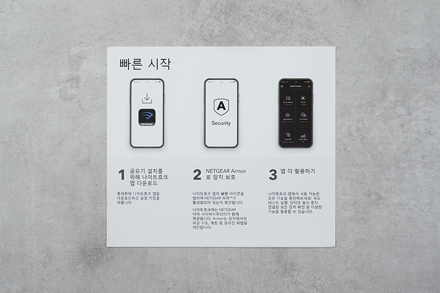 구성품을 살펴보면 빠른 시작 가이드가 한 장 포함되어 있습니다. 초기 설치와 설정은 넷기어 나이트호크 앱을 통해서 진행할 수 있고 넷기어 아머와 같은 보안 엔진도 활성화할 수 있습니다.