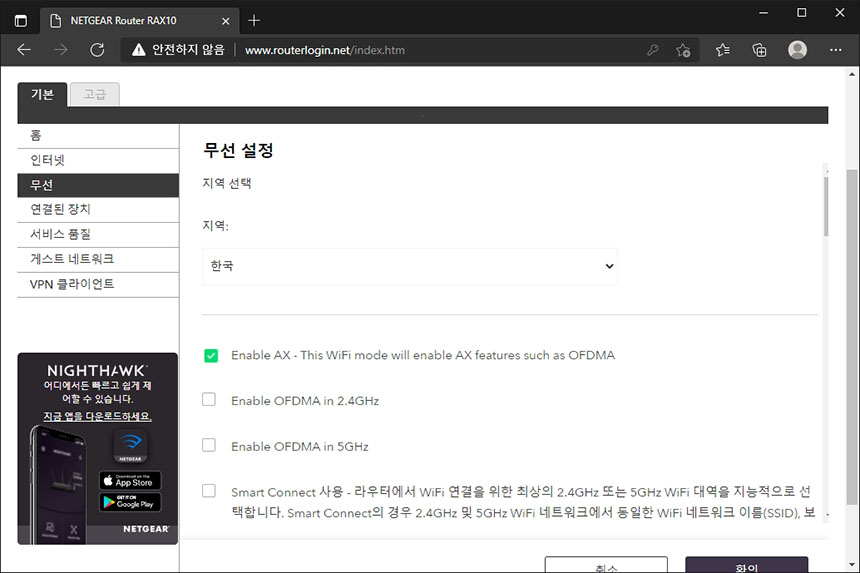 무선에서는 지역을 변경하거나 OFDMA 직교 주파수 분할 다중 액세스 기능을 켜고 끌 수 있습니다. 그리고 2.4GHz와 5GHz 주파수 대역을 하나의 이름으로 사용할 수 있는 스마트 커넥트 기능도 제공하고 있습니다.