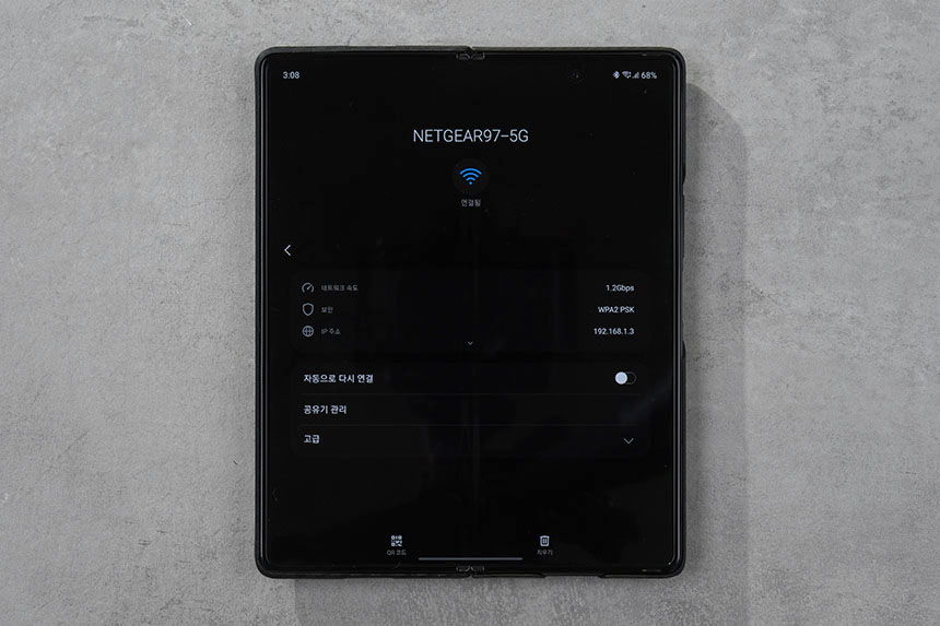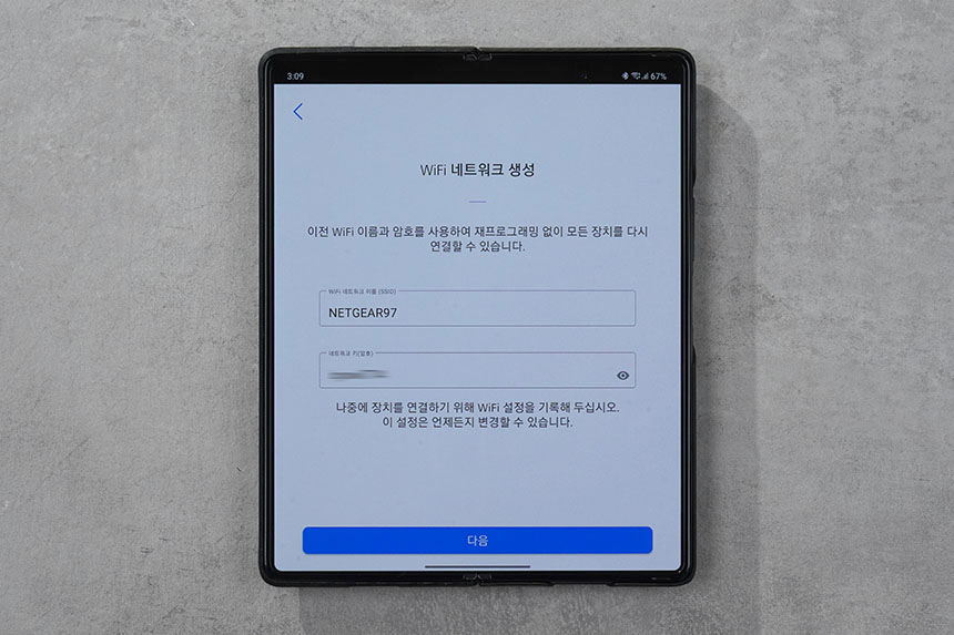 넷기어 RAX10 공유기의 초기 설치를 진행하는 과정은 간단한 편입니다. 우선 스마트폰의 와이파이 설정에서 NETGEAR97이라는 이름을 가진 공유기에 접속해주어야 합니다. 참고로 비밀번호는 보호필름이나 본체의 아래쪽에서 확인할 수 있습니다.
